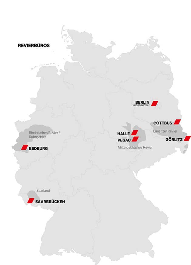 Cottbus und Görlitz im Lausitzer Revier, Bedburg im Rheinischen Revier/Ruhrgebiet, Halle/Saale und Pegau im Mitteldeutschen Revier sowie Saarbrücken im Saarland. In Berlin wurde ein Büro für die Projektleitung und revierübergreifende Koordination eröffnet.